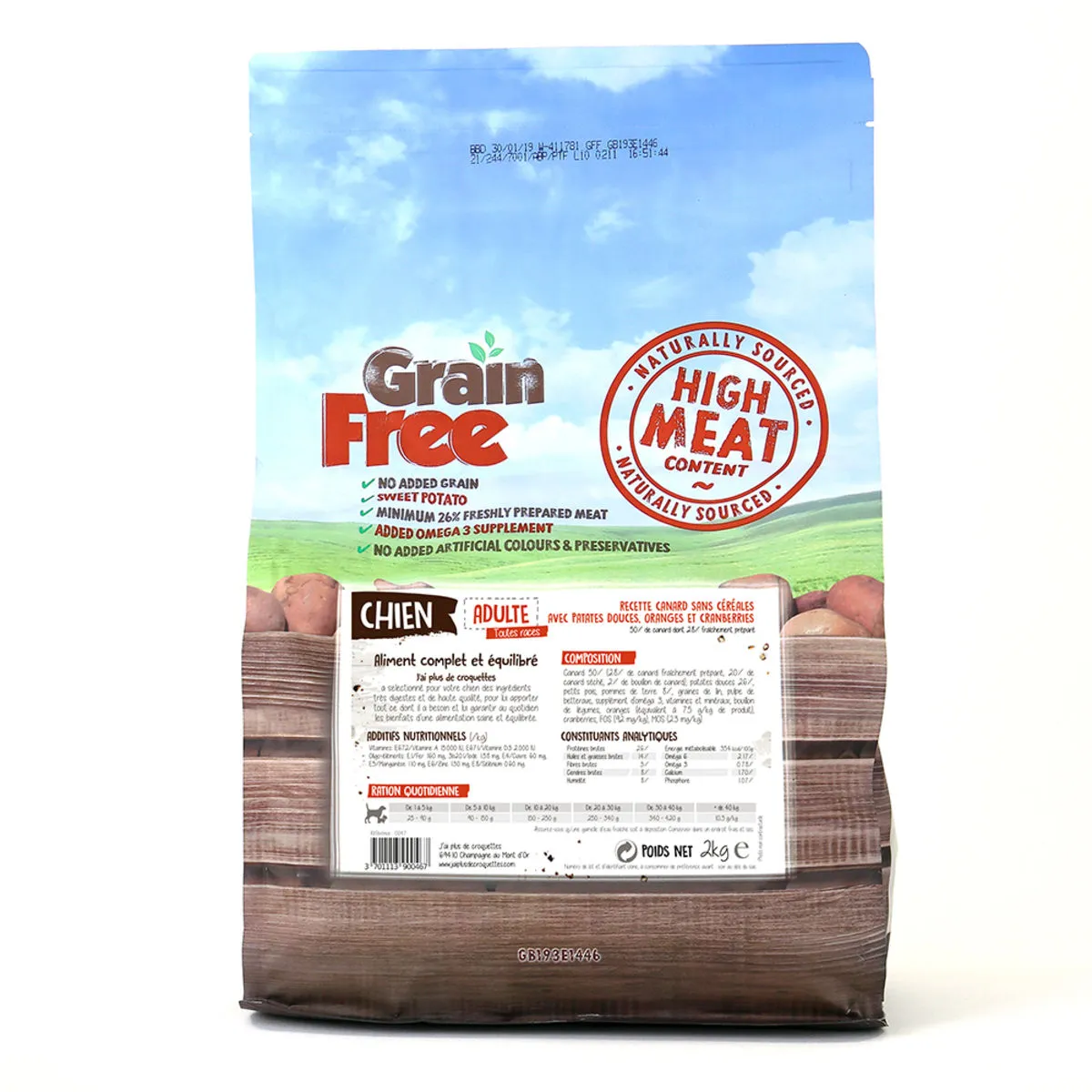 Canard 50 % (avec 28 % de canard fraîchement préparée, 20% de acnard déshydratée, 2 % de bouillon de canard), patates douces 2(6 %), petits pois, pommes de terre (8%), pulpe de betterave, graines de lin, supplément d‘oméga 3, vitamines et minéraux, bouillon de légumes, oranges (équivalent de 7,5g par kg de produit), cranberries, FOS (92 mg/kg), MOS (23 mg/kg)