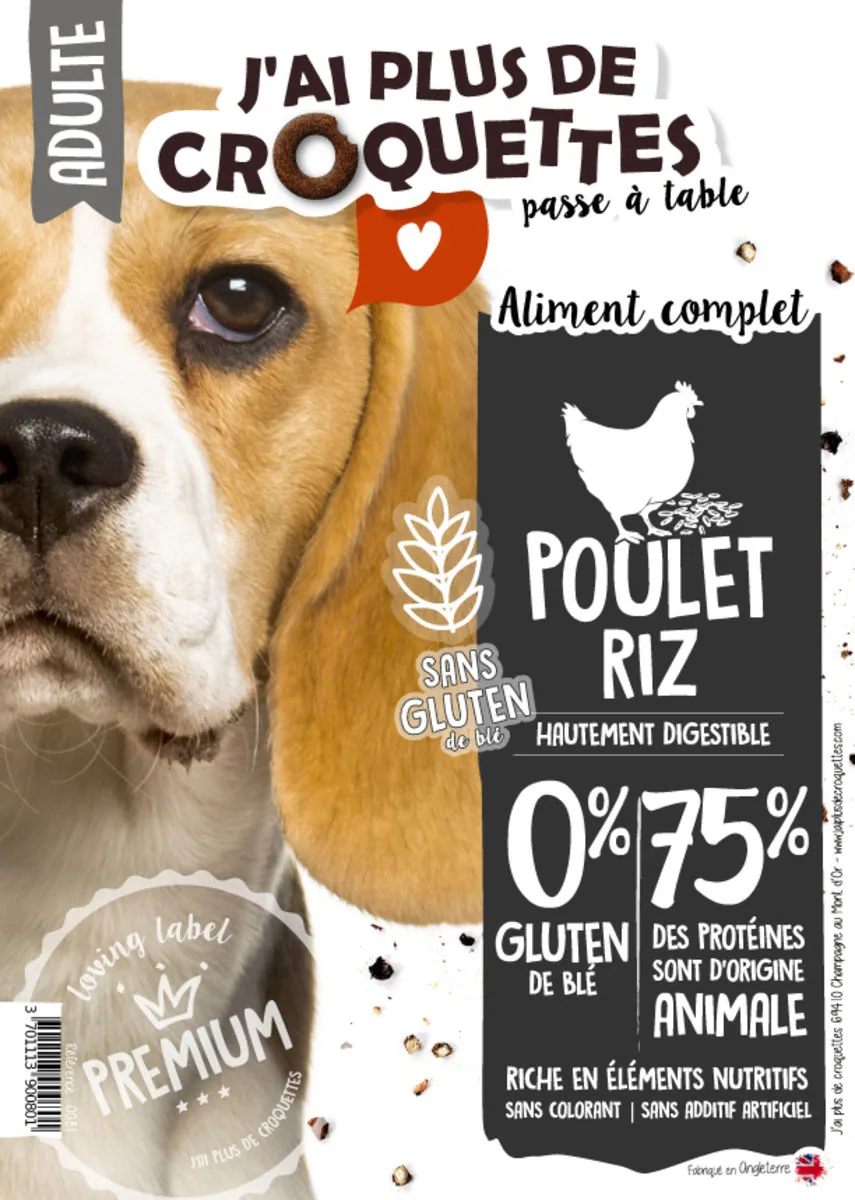 Poulet 29 % (y compris poulet séché 26 % et graisse de poulet 3 %), riz (26 %), orge, avoine, pulpe de betterave (2 %), poisson séché, levure de bière, minéraux, extrait de yucca (190 mg/kg).