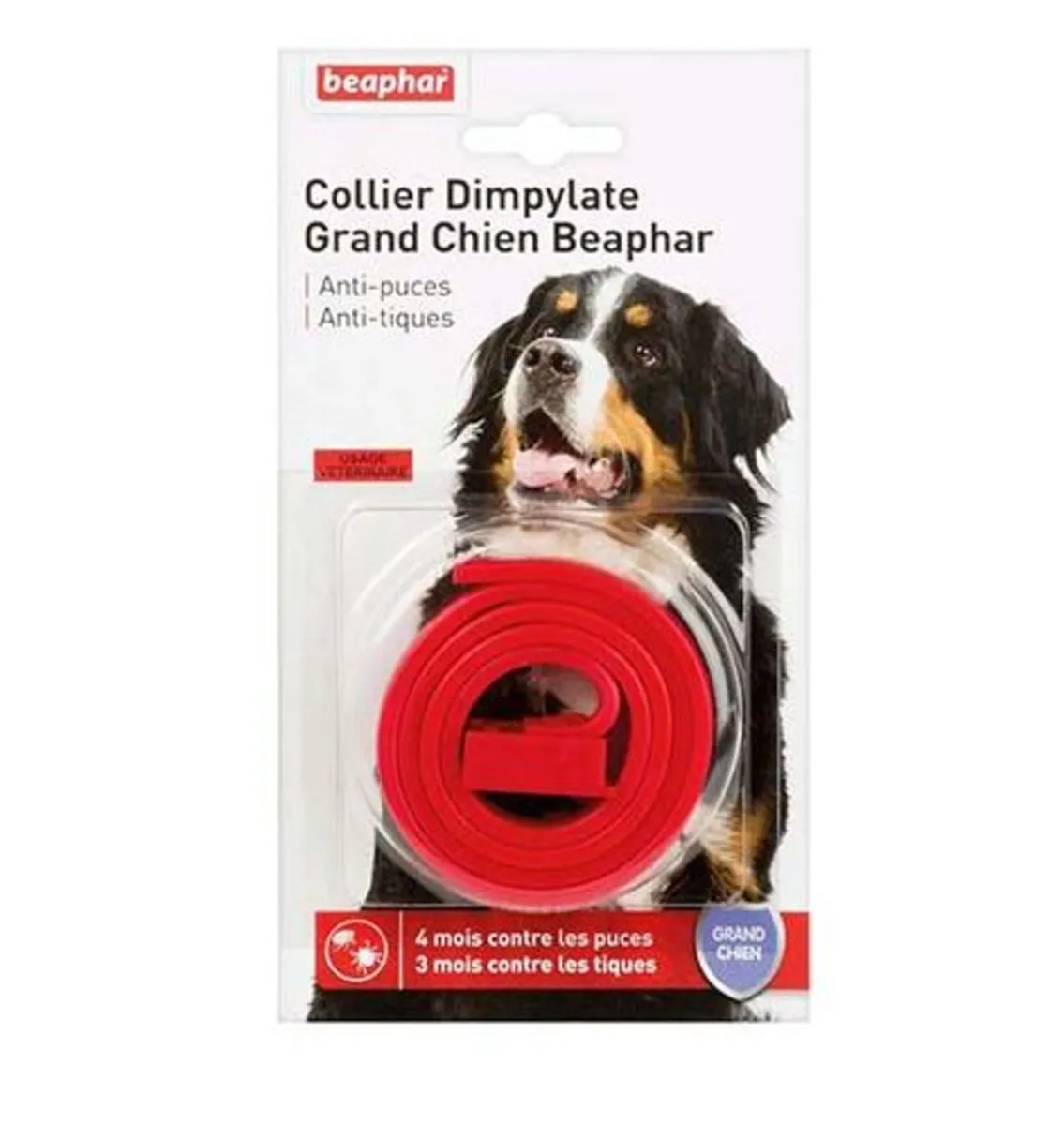 Le collier Dimpylate pour grand chien et un collier antiparasitaires pour chiens de grande race.