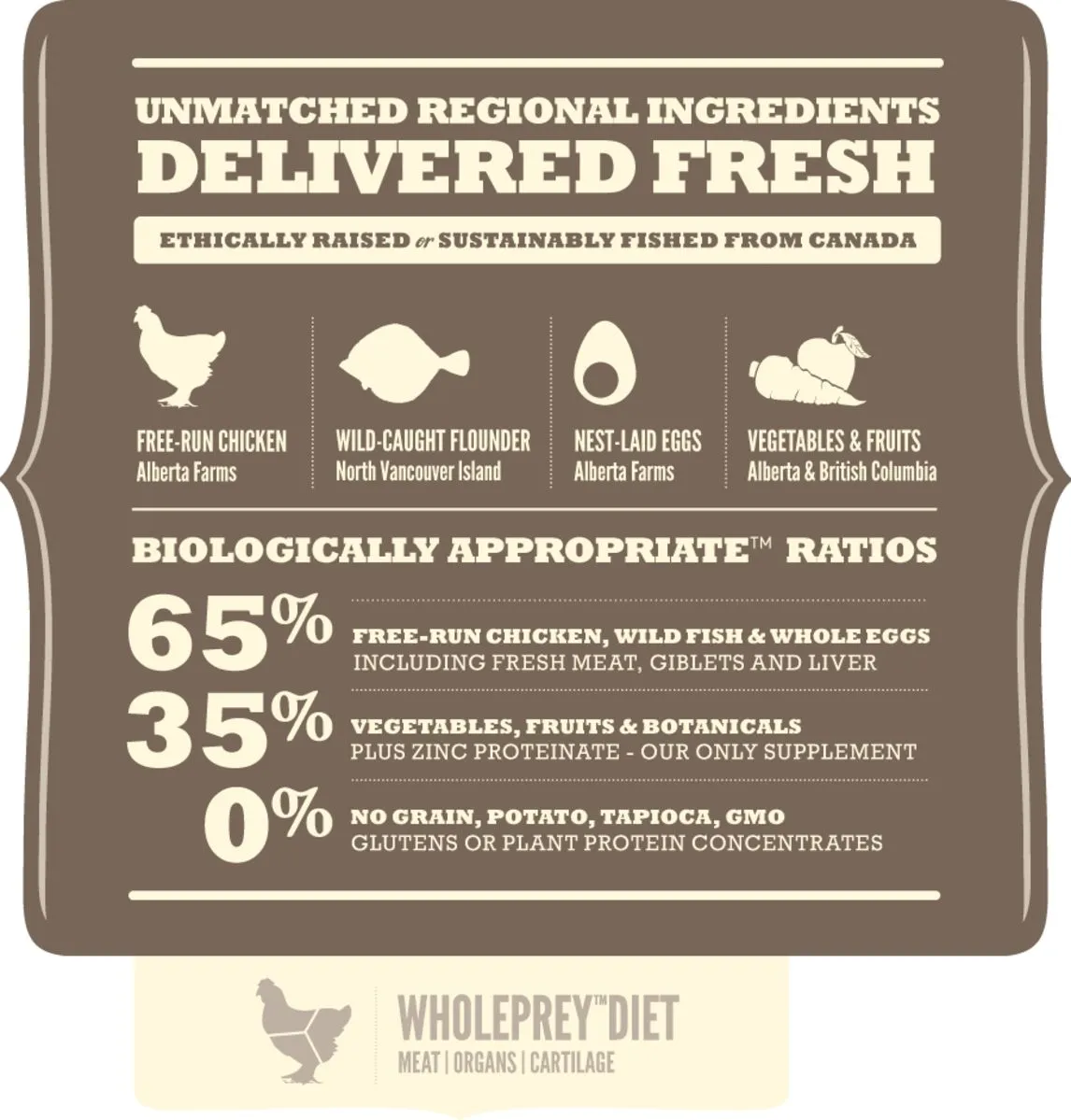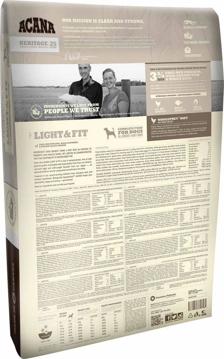 Poulet désossé frais (16 %), poulet déshydraté (14 %), dinde déshydratée (14 %), lentilles roses, petits pois entiers, fibres de pois, abats de poulet frais (foie, coeur, rognons) (5 %), hareng déshydraté (5 %), oeufs entiers frais (4 %), plie entière fraîche (4 %), luzerne séchée au soleil (4 %), féveroles (4 %), lentilles vertes, pois jaunes entiers, gras de poulet (1 %), huile de hareng (1 %), cartilages de poulet frais (1 %), varech, citrouille fraîche, courge poivrée fraîche, panais frais, chou vert frais, épinards frais, feuilles de moutarde fraîches, feuilles de navet fraîches, carottes fraîches, pommes Red Delicious fraîches, poires Bartlett fraîches, foie de poulet lyophilisé, foie de dinde lyophilisé, canneberges entières fraîches, myrtilles entières fraîches (bleuets), racine de chicorée, curcuma, chardon Marie, bardane, lavande, racine de guimauve, fruits de l’églantier. ADDITIFS (par kg) : Additifs nutritionnels : E6 (zinc) : 100 mg. Additifs zootechniques : Enterococcus faecium
