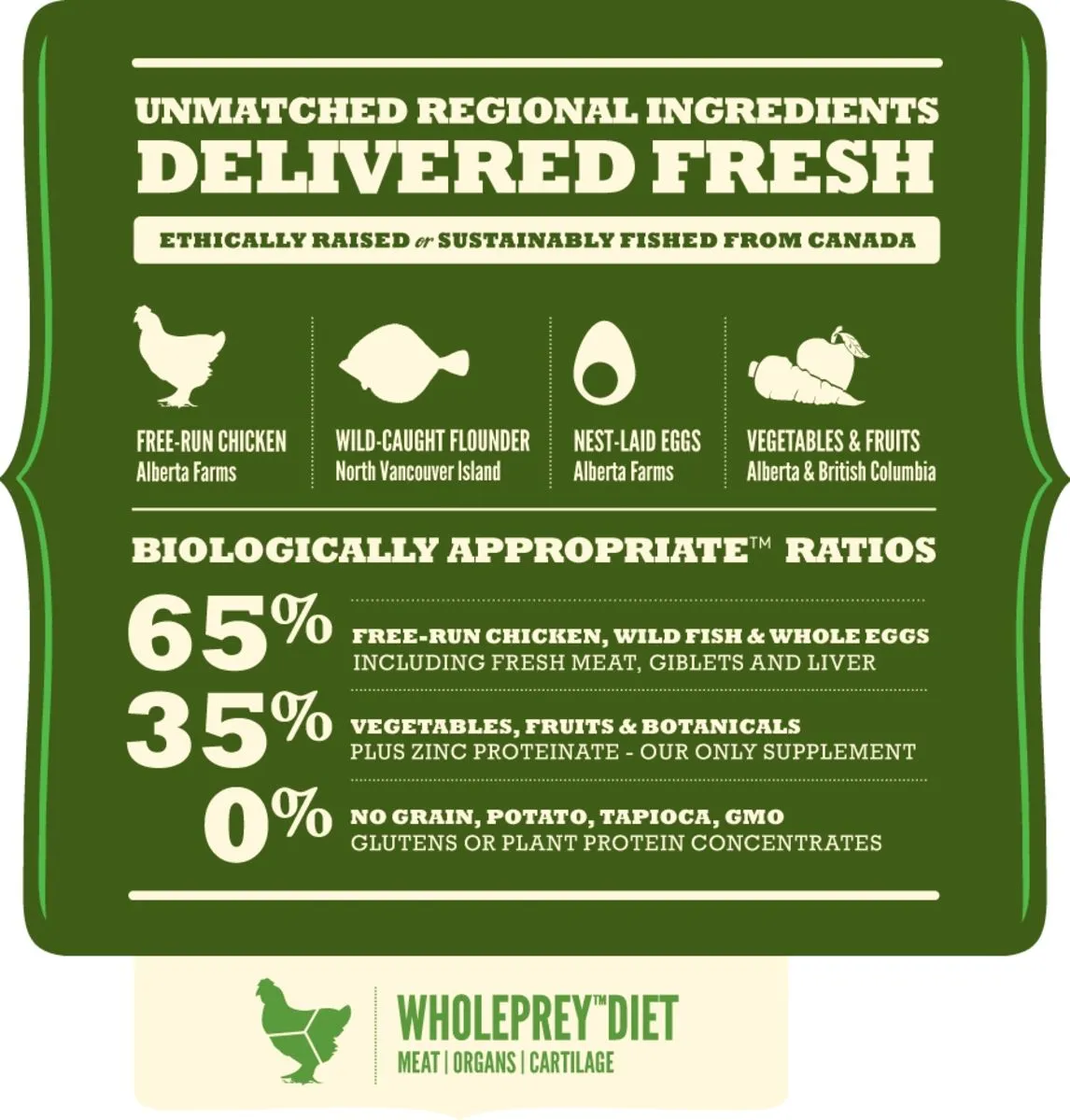 Poulet désossé frais (16 %), poulet déshydraté (15 %), dinde déshydratée (14 %), lentilles roses, petits pois entiers, abats de poulet frais (foie, coeur, rognons) (4 %), hareng déshydraté (4 %), fibres de pois, oeufs entiers frais (4 %), plie entière fraîche (4 %), huile de hareng (2 %), luzerne séchée au soleil (2 %), féveroles (2 %), lentilles vertes, pois jaunes entiers, gras de poulet (1 %), cartilages de poulet frais (1 %), varech, citrouille fraîche, courge poivrée fraîche, panais frais, chou vert frais, épinards frais, feuilles de moutarde fraîches, feuilles de navet fraîches, carottes fraîches, pommes Red Delicious fraîches, poires Bartlett fraîches, foie de poulet lyophilisé, foie de dinde lyophilisé, canneberges entières fraîches, myrtilles entières fraîches (bleuets), racine de chicorée, curcuma, chardon Marie, bardane, lavande, racine de guimauve, fruits de l’églantier. ADDITIFS (par kg) : Additifs nutritionnels : E6 (zinc) : 100 mg. Additifs zootechniques : Enterococcus faecium..