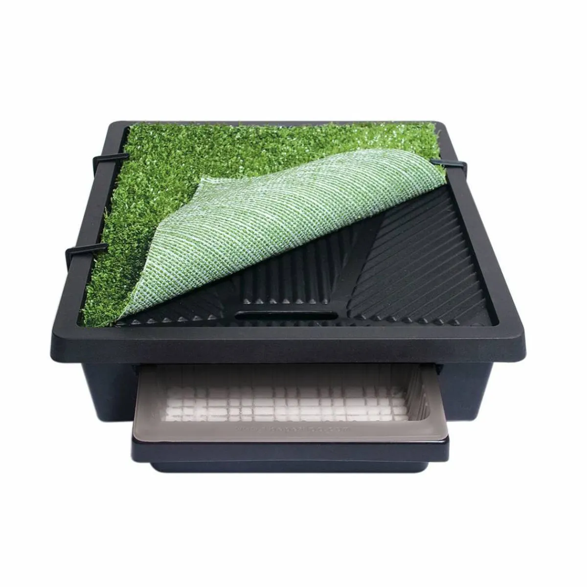 Le cadre contient un bac de récupération amovible et du gazon artificiel absorbant. L’urine s’infiltre à travers le gazon, s’écoule dans le bac de récupération et s’accumule dans le bac de récupération amovible.