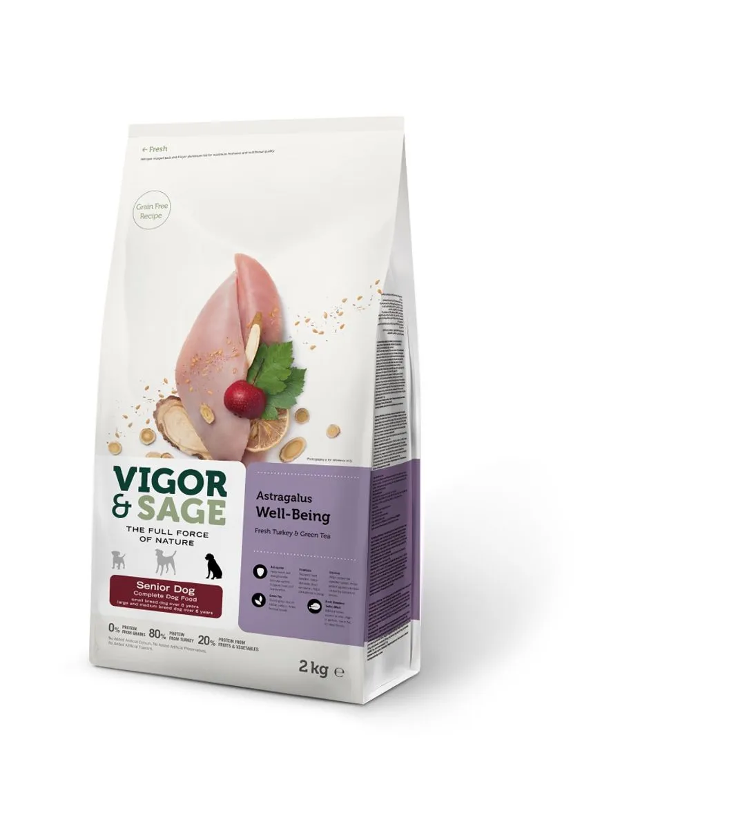 Caractéristiques des croquettes Poulet / Astragale / algues marines de Vigor & Sage pour chien senior :